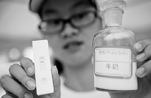 虽然价格不菲,但是检测起来非常方便,只要把牛奶滴几滴到上面,不到一分钟,就会出现红色的线,如果是一条,就证明牛奶中含有三聚氰胺,如果是两条就证明没有三聚氰胺。