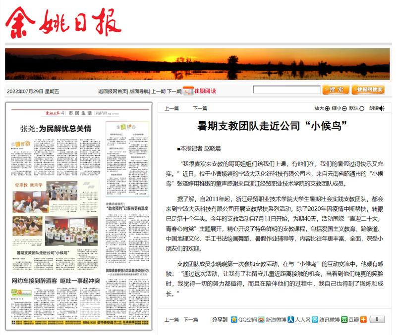 余姚日报:暑期支教团队走近公司“小候鸟”