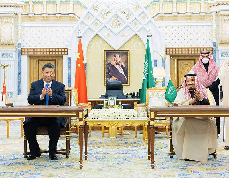 当地时间12月8日下午,国家主席习近平在利雅得王宫会见沙特国王萨勒曼。这是两国元首亲自签署《中华人民共和国和沙特阿拉伯王国全面战略伙伴关系协议》,同意每两年在两国轮流举行一次元首会晤。新华社记者 黄敬文 摄