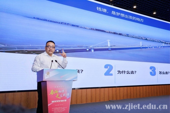 胡潜通过讲述地理优势、产业发展、城市环境三个方面带大家一同探寻了钱塘区的历史底蕴与文化魅力,详细介绍了钱塘区为青年所做的改革与服务举措,鼓励同学们勇敢地乘风破浪、勇立潮头、追逐梦想。