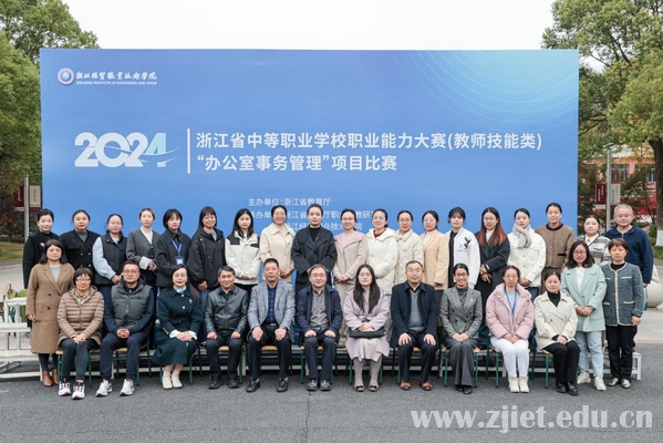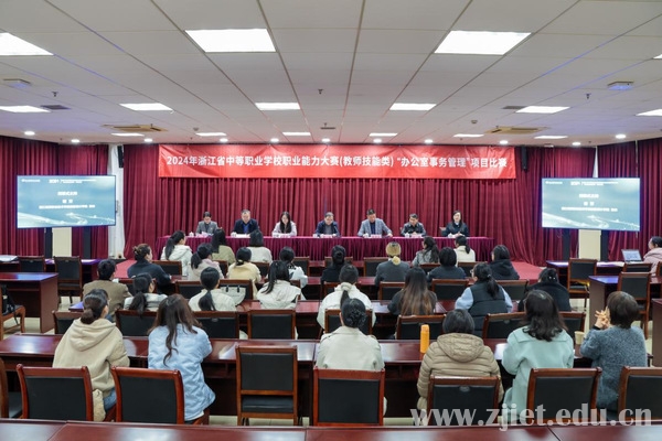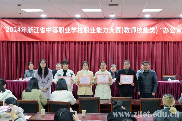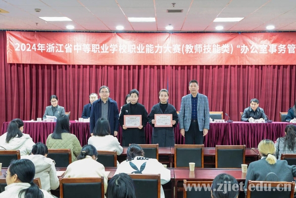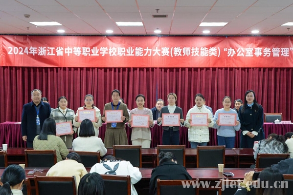 12月4日下午,2024年浙江省中等职业学校职业能力大赛(教师技能类)“办公室事务管理”项目比赛闭幕式在我校视频会议室举行。浙江省教育厅职成教教研室主任崔陵、浙江省教育厅职成教教研室老师俞晨欣、中国中文信息学会速记专业委员会副主任、大赛裁判长徐飚,学校校长陈德泉出席,各领队、参赛选手以及赛事相关工作人员参加。